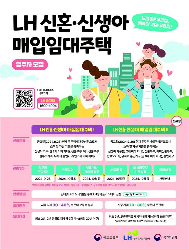 ‘신혼·신생아Ⅰ 매입임대주택’은 다가구, 다세대주택 등을 시세 30∼40% 수준으로 공급하는 유형이다. ‘신혼·신생아Ⅱ 매입임대주택’은 아파트·오피스텔 등을 시세 70∼80% 수준의 준전세형(임대조건의 80% 보증금, 월임대료20%)으로 공급해 임대료 부담을 줄여준다.