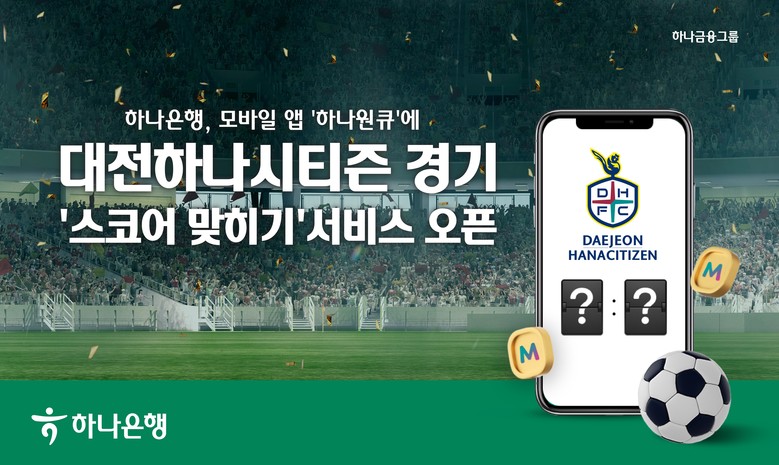 새로 오픈한 「스코어 맞히기」 서비스는 '하나원큐' 앱 로그인 후 '스포츠' 카테고리의 '대전하나시티즌' ‘스코어 맞히기’ 메뉴에서 진행된다. 특히, 하나은행 계좌 없이도 일반회원 가입을 통해 로그인이 가능해 누구나 쉽고 편리하게 이용할 수 있는 것이 특징이다.