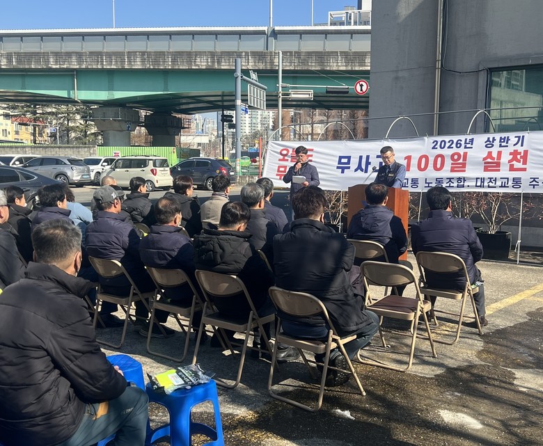 대전교통㈜ 차고지에서 진행된 이번 캠페인은 2026년 시내버스 무사고운동의 첫 시작을 알리는 무사고 100일 실천 결의대회로 운수종사자의 자발적인 참여를 대상으로 안전운행 실천 의지를 다졌다.