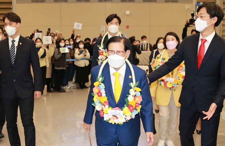 신천지 이만희 총회장이 28일 오후 인천국제공항 교통센터 1층 분수대앞 나래뷰가든에서 필리핀 해외순방후 귀국 기자회견을 하고 있다.지구촌의 평화운동과 전쟁종식을 아젠다로 활동하는 하늘문화세계평화광복, 신천지 이만희 총회장이 제32차 세계평화 필리핀 순회강연을 마친 뒤 귀국 보고회가 성황리 진행됐다.