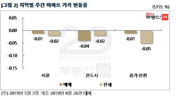 부동산114(www.r114.com)에 따르면 금주 서울 아파트 매매가격 변동률은 -0.01%로 집계됐다. 이는 작년 11월(11/16, -0.01%) 하락세로 돌아선 이후 가장 작은 낙폭을 기록한 것이다. 신도시와 경기ㆍ인천의 매매가격은 전주와 동일하게 각각 0.04%, 0.01% 떨어졌다. 전세가격은 서울이 0.02% 내려 전주(-0.07%) 대비 낙폭이 축소됐다. 신도시와 경기ㆍ인천은 각각 -0.02%, -0.05% 변동률로 약세를 이어갔다.