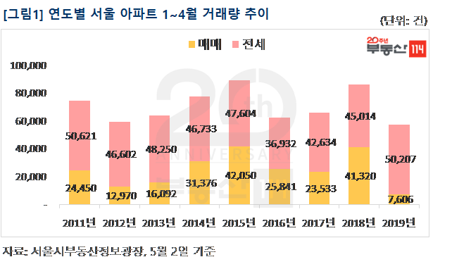 하지만 역대 최저 수준의 거래량임을 감안할 때 시장이 본격 회복세에 접어들었다고 속단하기는 어려워 보인다. 서울부동산정보광장에 따르면 올해 4월까지 서울 아파트 매매 거래량은 7,606건으로, 1~4월 기준으로 역대 최저치를 기록했다. 반면 같은 기간 서울 아파트 전세 거래량은 매매 거래량의 약 7배인 5만207건으로 집계됐다. 매매거래가 침체되면서 대기 매매수요가 전세로 눌러앉은 것으로 풀이된다.