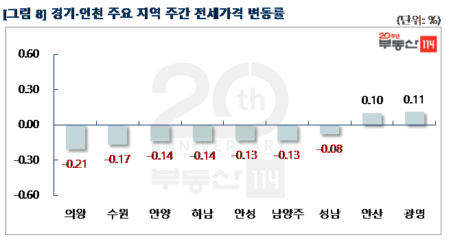 경기ㆍ인천은 ▼의왕(-0.21%) ▼수원(-0.17%) ▼안양(-0.14%) ▼하남(-0.14%) ▼안성(-0.13%) ▼남양주(-0.13%) 순으로 하락했다. 의왕은 장안지구, 백운밸리의 새 아파트 입주 여파로 거래 소강상태에 접어들었다. 내손동 의왕내손e편한세상, 포일자이 등은 전셋값이 500만원 떨어졌다. 수원은 망포동 영통아이파크캐슬1단지가 3월부터 입주하면서 인근 망포마을동수원LG빌리지Ⅱ, 망포마을현대아이파크2차가 1,000만원-2,000만원 내렸다. 반면 △광명(0.11%) △안산(0.10%)은 전셋값이 올랐다. 광명은 소형 위주로 수요가 이어지면서 하안동 e편한세상센트레빌이 1,000만원 상승했다.