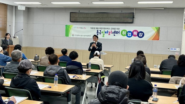 [동구 세계타임즈=심하린 기자] 인천 동구(구청장 김찬진)는 지난 26일 주민행복센터에서 지역 중장년 구직자 35명을 대상으로 ‘100세 시대 커리어 로드맵:새로운 일의 발견’ 특강을 성황리 마무리했다고 밝혔다.