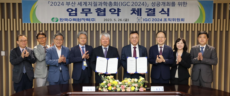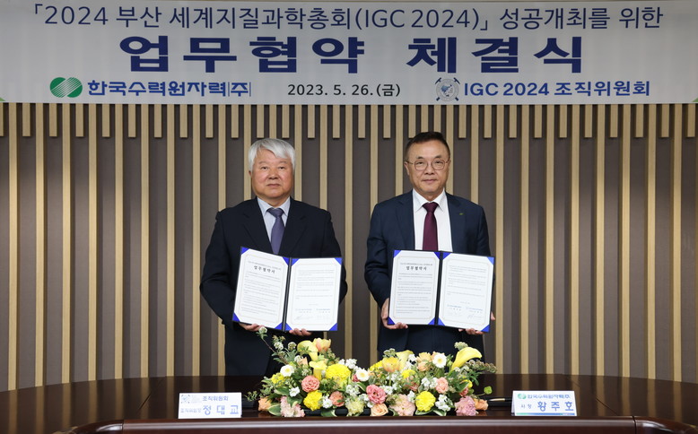[세계타임즈 = 이용우 기자] 한국수력원자력(사장 황주호, 이하 한수원)이 26일 세계지질과학총회 조직위원회와 ‘2024 부산 세계지질과학총회(이하 IGC)’의 성공 개최를 위한 업무협약을 체결했다.