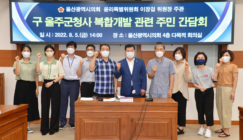 [울산 세계타임즈=이호근 기자] 울산광역시의회 이장걸 윤리특별위원장은 8월 5일 오후 2시, 시의회 4층 다목적회의실에서 ‘舊 울주군청사 복합개발에 따른 주민 의견 청취 간담회’를 가졌다.