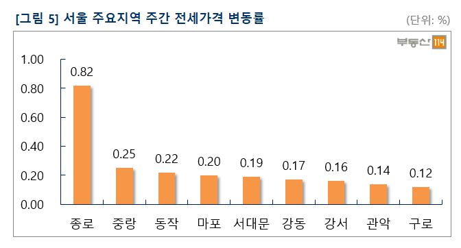 종로는 지난 2월부터 입주가 진행된 경희궁자이가 대부분 입주를 마감한 가운데 입주 초기 상대적으로 싸게 나왔던 전세 매물이 소진되면서 가격 오름폭도 컸다.