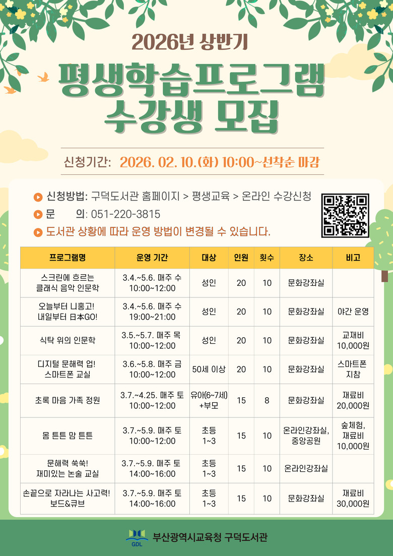 최인혜 구덕도서관장은 “이번 프로그램을 통해 지역 주민들이 배움의 즐거움을 경험하고 평생학습 역량을 키우길 바란다”며 “앞으로도 다양한 교육을 운영해 지역사회 평생교육을 활성화 하겠다”고 말했다.