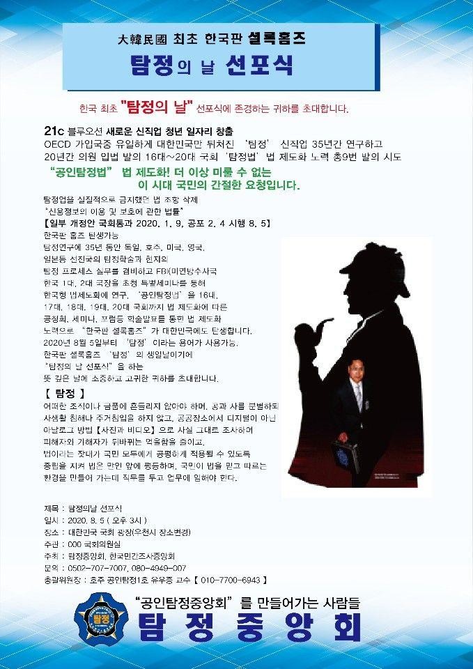 탐정중앙회(회장 유우종)는 8월 5일 오후 3시 국회 광장에서 대한민국 최초로 ‘탐정의 날’ 선포식을 개최한다고 밝혔다.