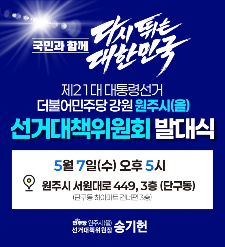 더불어민주당 송기헌 국회의원(강원 원주을·3선)은, 5월 7일(수) 오후 5시 단구동 선거사무소(서원대로 449, 3층)에서 ‘제21대 대통령선거 더불어민주당 강원 원주시(을) 선거대책위원회(위원장 송기헌 의원) 발대식’을 개최한다.