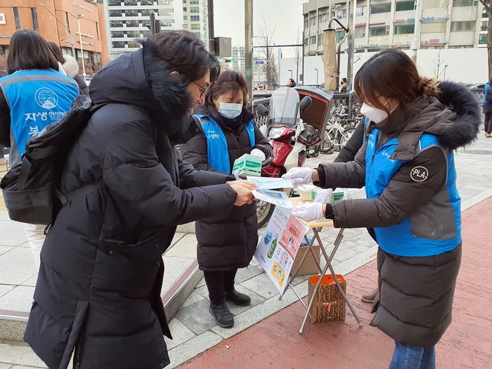 | ▲강남자생봉사단원이 시민에게 마스크를 전달하고 신종 코로나바이러스 감염증 예방법을 설명하고 있다. |