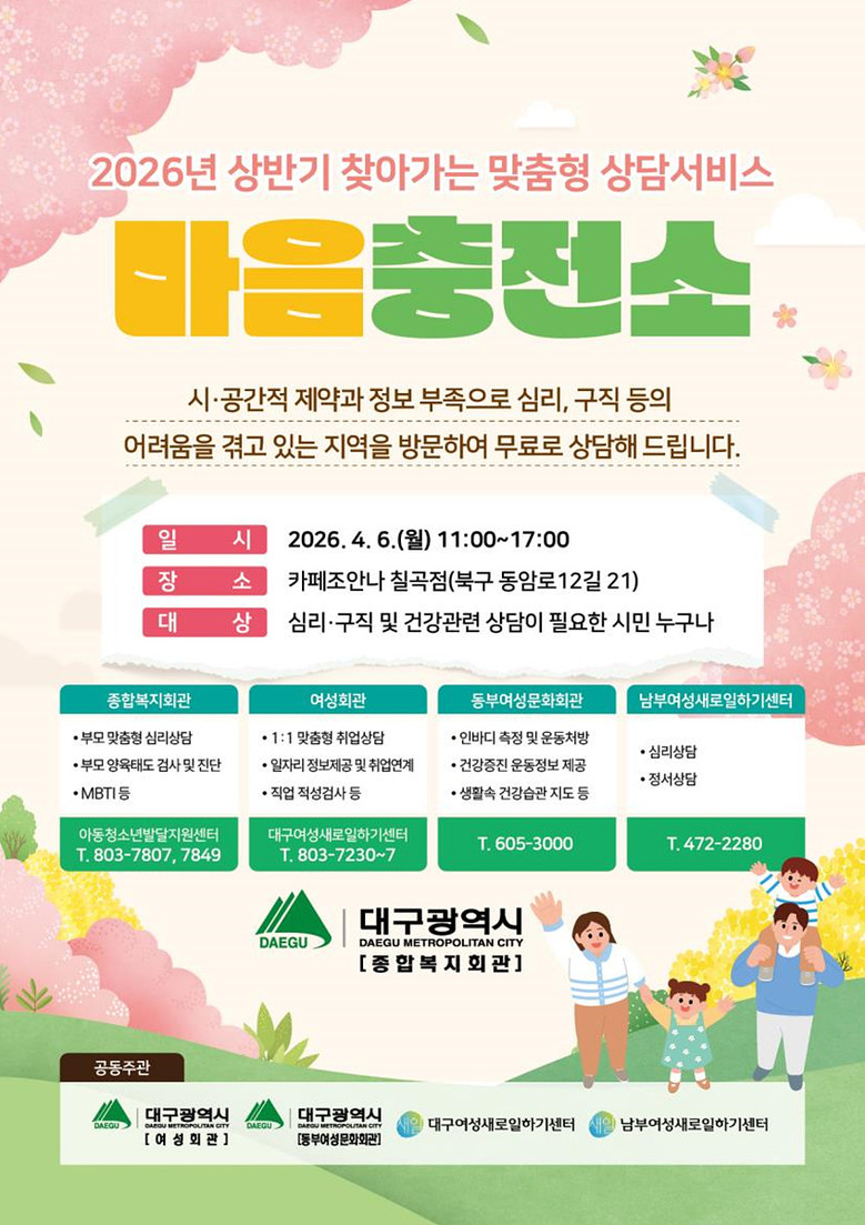 정재석 대구광역시 도시관리본부장은 “이번 ‘마음충전소’는 시민들이 일상 속에서 겪는 다양한 고민을 보다 편안한 환경에서 상담받을 수 있도록 마련한 자리”라며 “앞으로도 시민 중심의 맞춤형 복지서비스를 지속적으로 확대해 나가겠다”고 말했다.