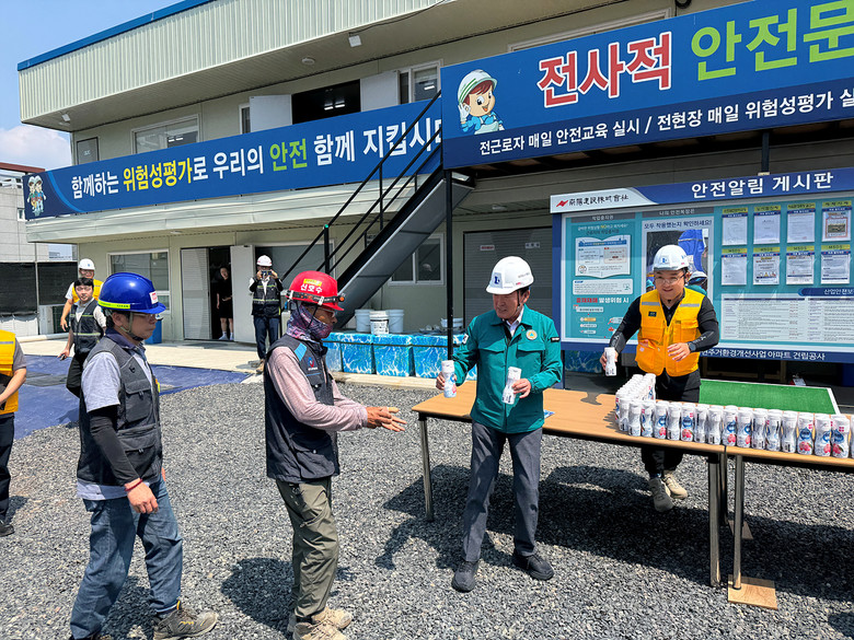 정명섭 사장은 앞서 실시한 불시 안전점검 결과를 바탕으로 폭염대비 우수현장을 선정해 포상을 수여했으며, 전해질 음용수를 근로자들에게 직접 전달하며 감사와 격려를 전했다.