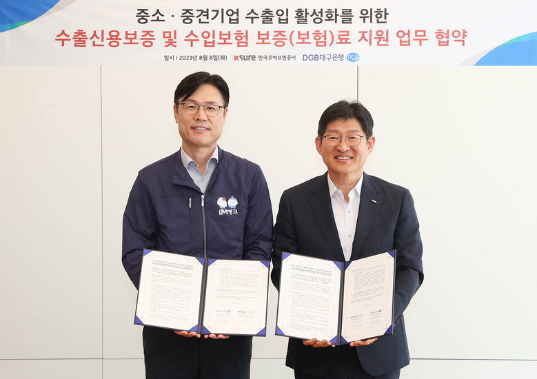 이번 업무 협약에 따라 DGB대구은행은 수출신용보증상품 및 수입보험 신규 가입 고객 대상으로 금융권 최대 혜택을 진행해 최초 2회 한도로 1,000만원 범위 내에서 납부할 보증(보험)료의 50%를 지원한다. 또한 보증한도가 30만불 이하인 수출신용보증(포괄매입)의 경우 납부할 보증료 전액을 지원할 예정이다.