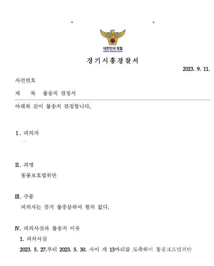 또 지난 5월 27일부터 5월30일까지 개 13마리를 도축헸다는 이유로 동물보호법 위반으로 형사고발 사건도 그러나 지난 9월 11일 '증거 불충분으로 혐의가 없다'는 최종 결과가 나왔다.