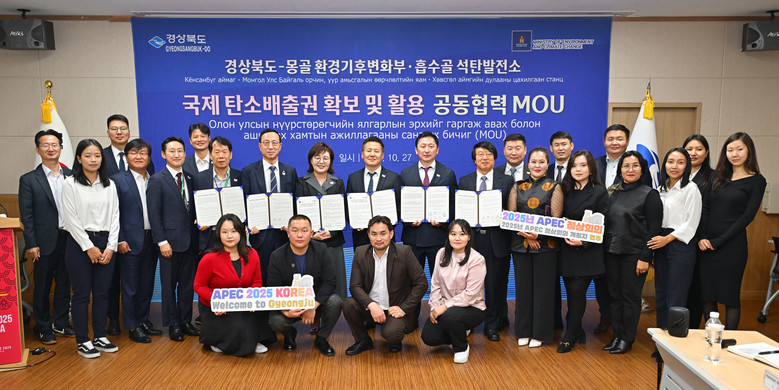 - 양금희 부지사, 기후외교는 함께 잘사는 글로벌 미래공동체 비즈니스 - [세계타임즈=경북 한윤석 기자] 경북도는 27일 에이펙(APEC)이 열리고 있는 경주엑스포대공원 회의실에서 몽골 환경기후변화부, 에너지부, 울란바타르시가 참여한 가운데 탄소배출권 사업 등에 대한 업무협약(MOU)을 체결했다.