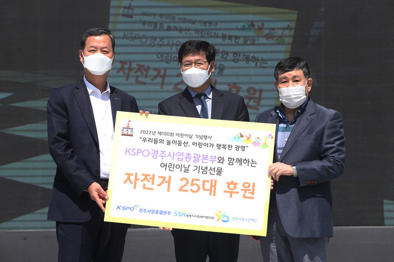 지난 5일에 광명시민체육관에서 열린 광명시 주최 “제100회 어린이날 기념행사”에서 공단 경주사업총괄본부는 지역 내 어려운 환경에 있는 소외된 아동들에게 건강과 즐거움 그리고 희망을 선사하기 위해 자전거 25대(500만원 상당)를 전달했다.