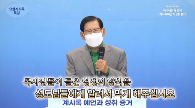 이만희 총회장은 27일 요한계시록 세미나 마지막 특강에서 “계시록 예언 및 성취 내용을 지구촌 각국에 널리 전하기 위해 12지파장들을 통해 장(章)별 세미나 형태로 전해왔다”며 “목사님이 들었으니 자신의 교회 성도들에게 배운 내용을 알려서 영생의 양식으로 먹여줘야 한다”고 강조했다.