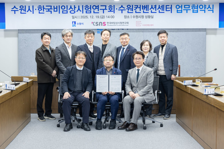 [수원시 세계타임즈=송민수 기자] 수원특례시(시장 이재준)와 (재)수원컨벤션센터(이사장 정길배), 한국비임상시험연구회(회장 박중훈)는 19일 시청 상황실에서 ‘경제자유구역 및 바이오산업 활성화를 위한 업무협약’을 체결하고 협력을 약속했다.