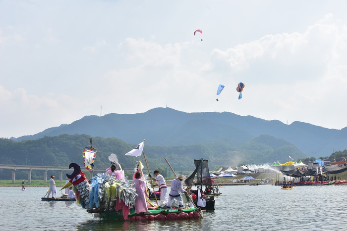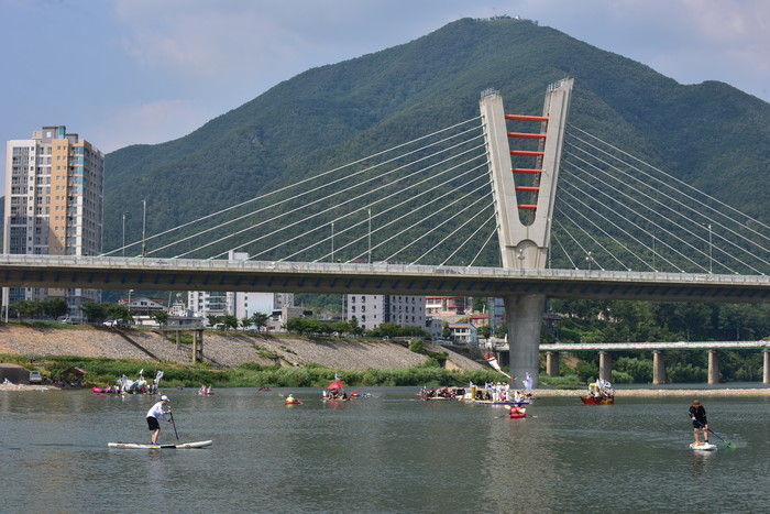 2018 동강뗏목축제의 하이라이트인 동강퓨전뗏목만들기대회 2일차 경기에 참가한 뗏목들이 경주대결을 펼치고 있다.