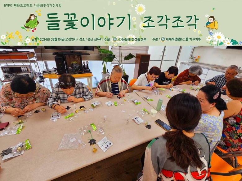 ㈔세계여성평화그룹(IWPG) 파주지부(지부장 최재순)는 4일 다문화가정 인식 개선 평화 프로젝트 ‘들꽃이야기’의 일환으로 ‘조각조각’ 행사를 진행했다고 밝혔다. ‘조각조각’ 행사는 파주 문산 선유리에서 사할린 동포회와 한국인 등 약 16명이 모인 가운데 진행됐다. ‘조각조각’이라는 이름은 서로의 다양성을 인정하고 포용하며, 우리 자신을 하나의 조각으로 표현해 다문화 가정도 사회구성원으로 인정하는 의미를 담는다.