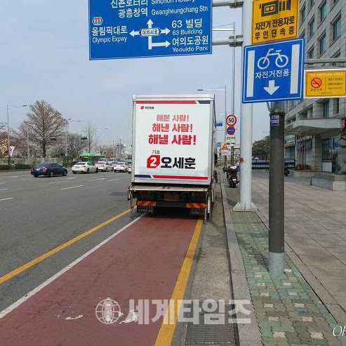 [세계타임즈 이채봉 기자]국민의힘 오세훈 서울시장후보 선거유세차량이 전용 자전거도로 통행을 막고 선거운동을 하고있다