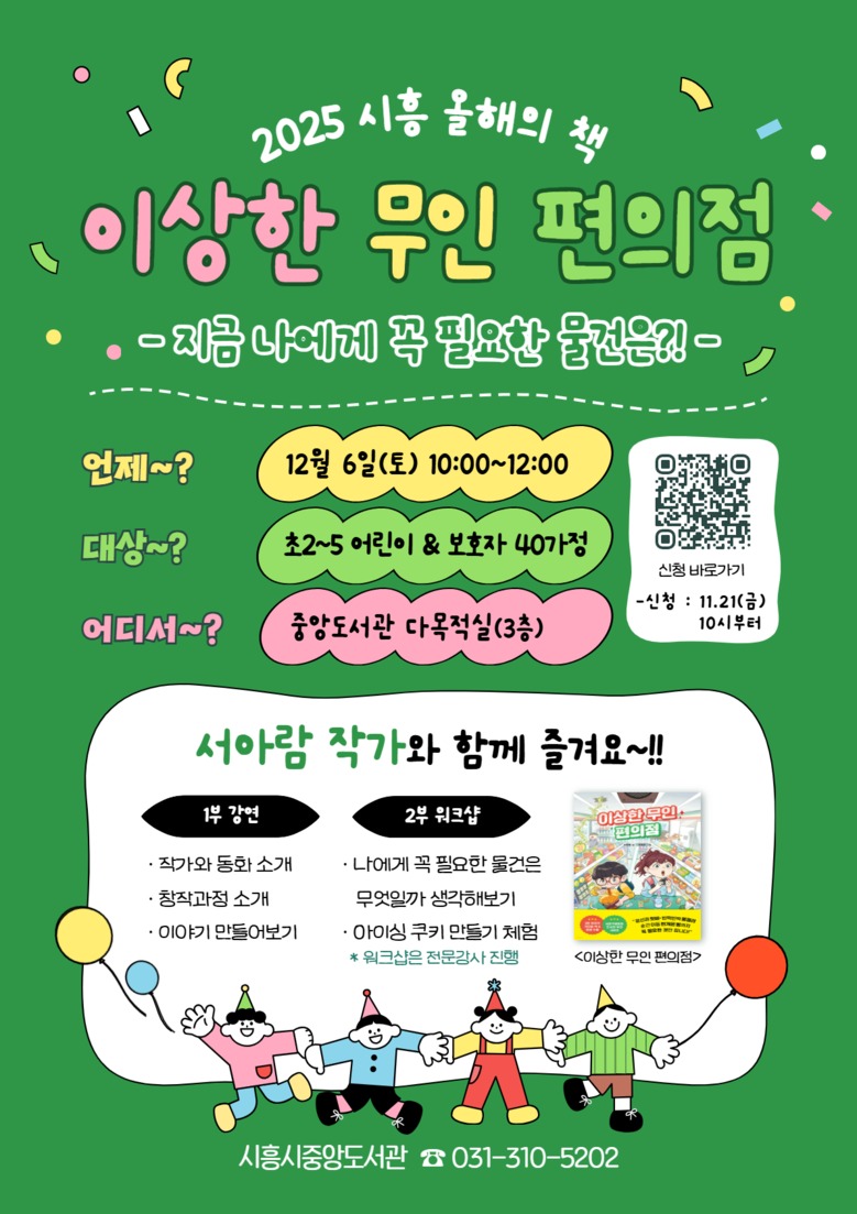 전행주 시흥시중앙도서관장은 “올해의 책을 함께 읽고 작가와 직접 이야기를 나누는 경험은 어린이들의 상상력과 창의력 향상은 물론, 자신을 표현하는 능력을 키우는 데에도 큰 도움이 될 것”이라며 “가정이 함께 참여해 독서의 즐거움을 나누는 시간이 되길 바란다”라고 말했다.