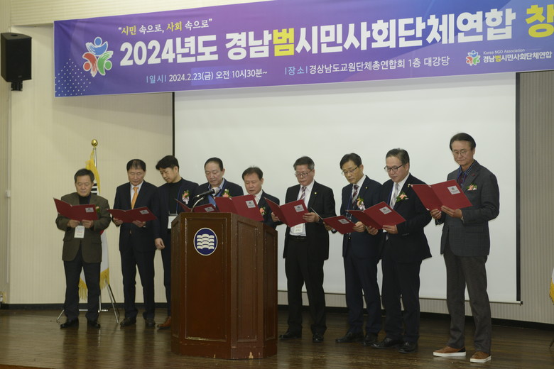 [세계타임즈]최성룡기자 = (사)범시민사회단체연합 경남지부가 2024년 2월23일 (화) 오전 10시 경남교총 1층 대강당에서 창립총회가 개최 됐다.