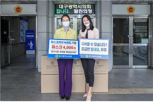 [대구=세계타임즈 한성국 기자] 대구광역시의회 배지숙 의장은 4월 1일(수) 오전 10시 시의회 1층에서 (사)미스코리아녹원회(이하 녹원회)가 기부한 마스크 4천장을 인수하여 대구광역시로 전달했다.