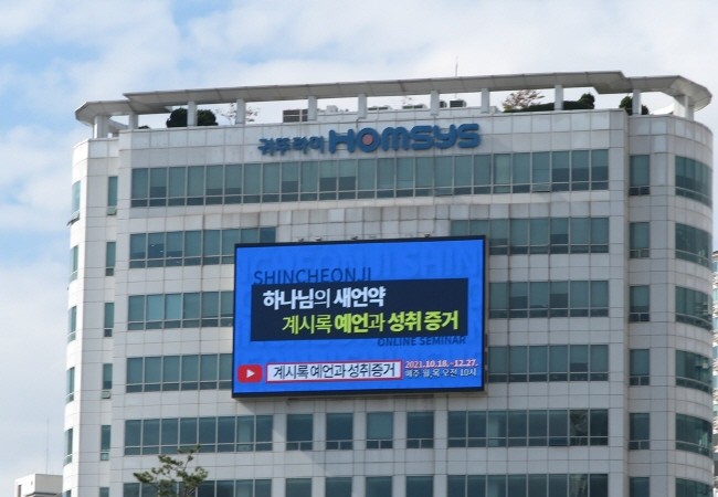 [세계타임즈 백진욱 기자] 서울 강서구의 한 빌딩 광고 전광판에 신천지예수교회의 ‘온라인 말씀 세미나’ 광고 영상이 등장해 주목을 끌고 있다.