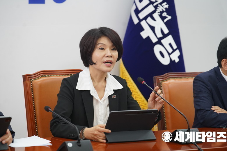 '한정애' 더불어민주당 정책위의장이 28일 국회에서 열린 정책조정회의에서 발언하고 있다.