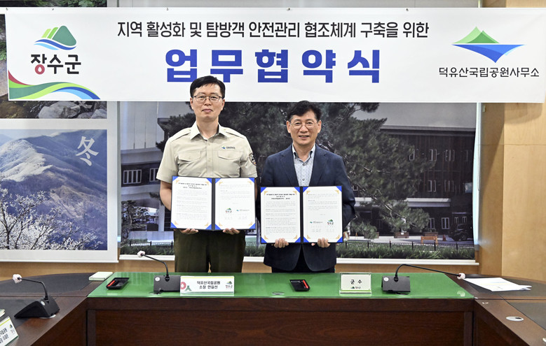 탐방로 안전관리 및 재난·재해 대응, 이용 활성화 협조체계 구축 [세계타임즈=장수군 김서주 기자] 장수군은 지난 20일 국립공원공단 덕유산국립공원과 ‘지역 산악 관광 활성화 및 탐방객 안전관리 협조체계 구축을 위한 업무협약(MOU)’을 체결했다고 밝혔다.