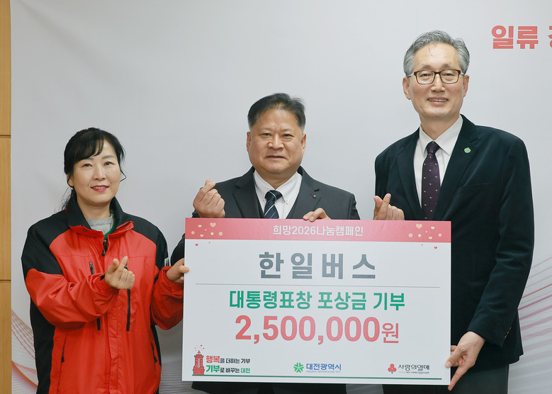 이번 성금은 2025년 대중교통 경영 및 서비스평가 시내버스 분야 대통령 표창을 수상한 데 따른 포상금으로, 대중교통 운영 성과를 지역사회에 환원하고 어려운 이웃과 나눔을 실천하고자 마련됐으며, 기탁된 성금은 대전사회복지공동모금회를 통해 지역 내 취약계층을 위해 사용될 예정이다.