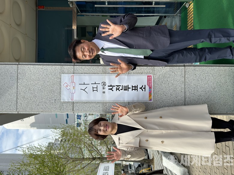 [세계타임즈 = 최성룡 기자] 녹색정의당 여영국 후보와 배우자 한경숙 씨가 5일 오전 9시 30분 창원시 성산구 사파동 사전투표소에서 사전투표 후 포즈를 취하고 있다.//사진=여영국 후보 선거사무소 제공