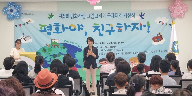 [세계타임즈 백진욱 기자] (사)세계여성평화그룹 글로벌 8국(IWPG, 글로벌국장 최강순)은 24일 제5회 ‘평화사랑 그림그리기 국제대회’ 예선 시상식을 양천구 갈산문화예술센터에서 개최했다.