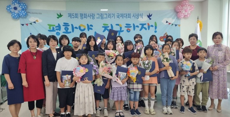 ▲제5회 ’평화사랑 그림그리기 국제대회‘ 예선 시상식에 참석한 수상자들이 단체사진 촬영을 하고 있다.
