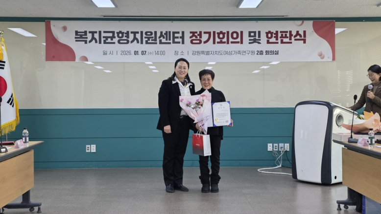 [강원도 세계타임즈=김민석 기자] 강원특별자치도여성가족연구원(원장 김숙영) 복지균형지원센터는 2026년 1월 7일(수), 센터 출범 3주년(1월 9일)을 맞아 ‘복지균형지원센터 유공자 시상 및 현판 제막식’을 개최하였다.