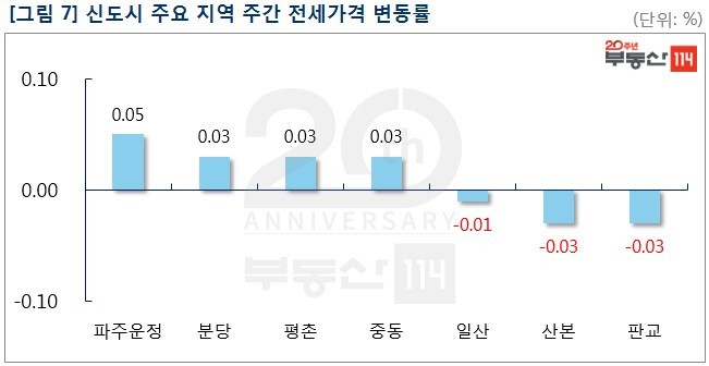 신도시는 △파주운정(0.05%) △분당(0.03%) △평촌(0.03%) △중동(0.03%) 등이 올랐다. 파주운정은 일부 단지에 전세 수요가 늘면서 와동동 가람마을8단지동문굿모닝힐이 250만원 상승했다. 분당은 수내동 양지1단지금호, 서현동 시범한양이 1,000만원-2,500만원 올랐다. 반면 아직까지 전세 수요 움직임이 크지 않은 ▼판교(-0.03%), ▼산본(-0.03%)과 킨텍스 원시티 입주 영향을 받고 있는 ▼일산(-0.01%)은 소폭 내렸다.