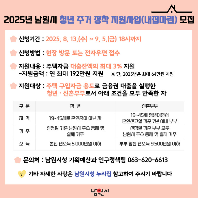 세부사항은 남원시 누리집을 참고하거나 기획예산과(620-6613)으로 문의하면 된다.