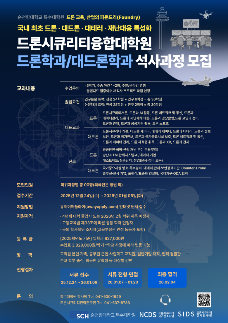 [세계타임즈]최성룡기자 = 순천향대학교(총장 송병국)는 국내 최초로 드론과 대드론(안티드론) 분야를 융합한 전문대학원인 ‘드론시큐리티융합대학원(Graduate School of Drone Security Convergence)’을 공식 개원하고 25. 12.24.~26.1.6.간 드론학과, 대드론학과 석사과정 신입생을 선발한다.