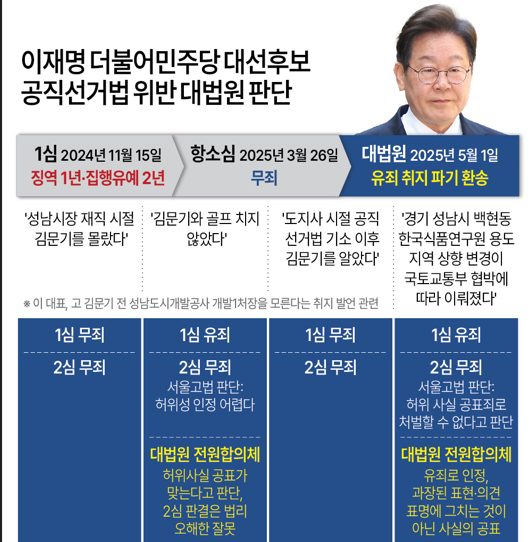 이흥구·오경미 대법관은 이 후보의 골프 발언, 백현동 관련 발언 모두 다의적으로 해석할 수 있으므로 검찰 공소사실과 같이 해석해 유죄로 단정할 수 없다는 반대의견을 남겼다.검찰은 이 후보를 2022년 9월 8일 재판에 넘겼다. 1심은 유죄를 인정해 징역 1년에 집행유예 2년을 선고했으나 2심은 이 후보 발언이 '인식' 또는 '의견 표명'에 불과하므로 처벌할 수 없다며 전부 무죄를 선고했다.대법원은 지난 3월 28일 사건을 접수한 뒤 국민의 관심이 지대하고 유력 대권 주자인 이 후보의 피선거권 여부가 달려있다는 점을 고려해 이례적으로 빠르게 사건을 심리했다.조 대법원장이 직접 전원합의체에 회부하고 지난 22일과 24일 두 차례 대법관 합의기일을 연 뒤 사건 접수 34일 만인 이날 검찰의 상고를 받아들여 2심 판결을 파기했다.