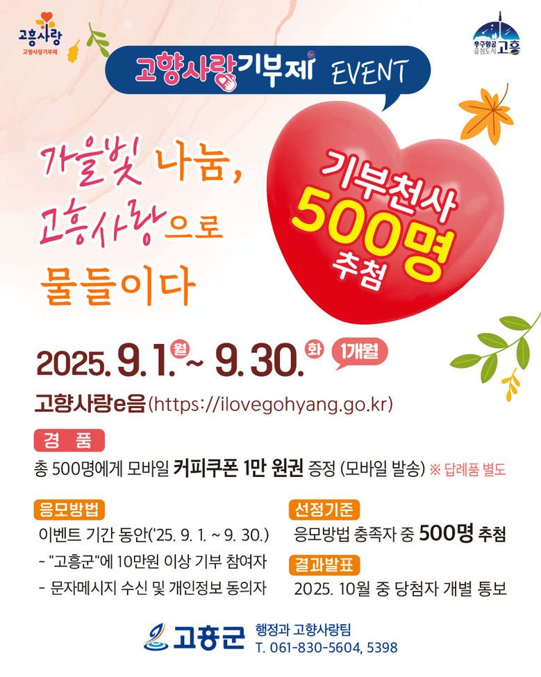 군 행정과 관계자는 “이번 가을맞이 이벤트는 고흥을 응원해 주신 기부자 여러분께 감사의 마음을 전하기 위한 것”이라며 “앞으로도 계절별 다양한 이벤트를 통해 기부 참여를 확대하고, 지역경제와 군민 복리에 실질적인 도움이 되도록 최선을 다하겠다”고 말했다.