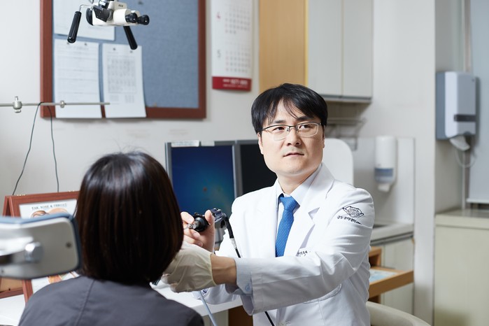 | ▲강동경희대병원 이용찬 교수가 한 여성환자를 진료하고 있다. |