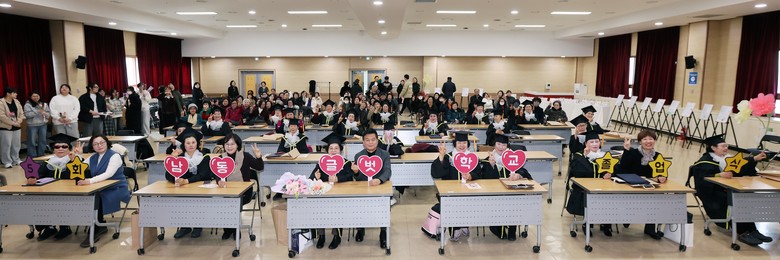 행사는 졸업장 수여와 모범상, 개근상 시상, 구청장 축사, 송사, 답사, 기념 촬영 순으로 진행되었으며, 시화 작품과 학습 결과물을 전시해 그동안의 배움의 여정을 한눈에 볼 수 있는 자리도 마련되었다.
