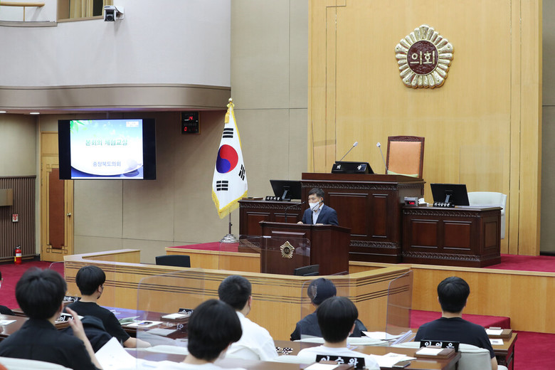 현장학습의 일환으로 진행된 이번 행사에서 학생들은 의장·의원석에 앉아 조례안과 건의안을 처리하고 5분 자유발언을 하는 등 실제 충북도의원으로서의 본회의 의정 활동을 직접 체험했다.