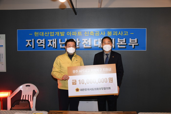 아울러 김용집 의장은 “광주의 아픔을 걱정해주고 도움을 준 시도의회의장협의회에 감사하다”며 “피해자 가족들과 구조대원들은 물론 시민들에게도 시도의회 의장들의 따뜻한 마음을 전하겠다”고 밝혔다.