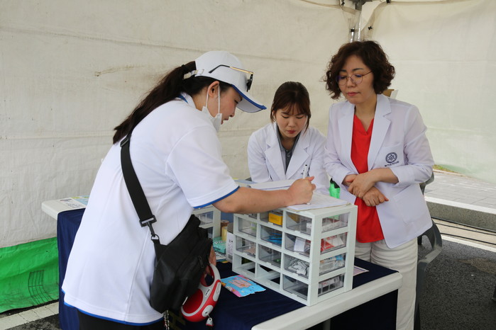 2018 화성뱃놀이 축제를 찾은 관광객들을 위해 무료봉사 약국을 운영 중인 화성시 약사회. ▼