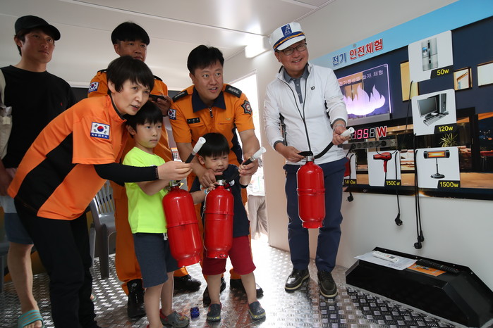 2018 화성 뱃놀이 축제를 찾은 아이들이 채인석 화성시장과 함께 소화기 사용법을 체험으로 배우고 있다. ▼