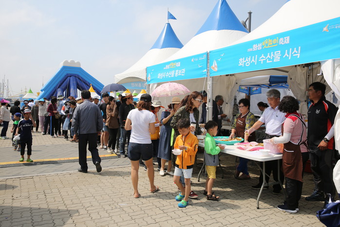 맛있는 게 튀김 시식하세요! 2018 화성 뱃놀이 축제를 찾은 관광객들이 맛좋은 지역 수산물을 체험할 수 있도록 행사가 열리고 있다. ▼