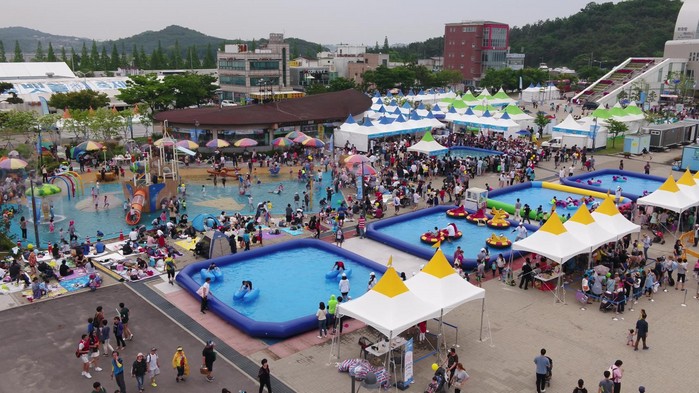 2018 화성 뱃놀이 축제를 찾은 가족이 펀보트를 타고 물놀이를 즐기고 있다. ▼